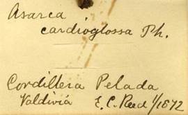 Already in his early years in Chile Reiche had been attracted by the orchids of his adoptive country. A few types of new orchid species collected by Reiche are kept at the National Museum in Santiago, and other specimens at the Harvard University Herbaria, all dated between 1872 and 1897 (Muñoz Schick 1971): Asarca cardioglossa Phil. ex Reiche (Fig. 18-19), Asarca grandulifera var. illapelina Reiche, Chloraea leptopetala Phil. ex Reiche, and Chloraea viridiflora var. reticulata Phil. ex Reiche. One additional orchid species, Asarca littoralis was later described by Reiche based on Chloraea littoralis (Phil.).