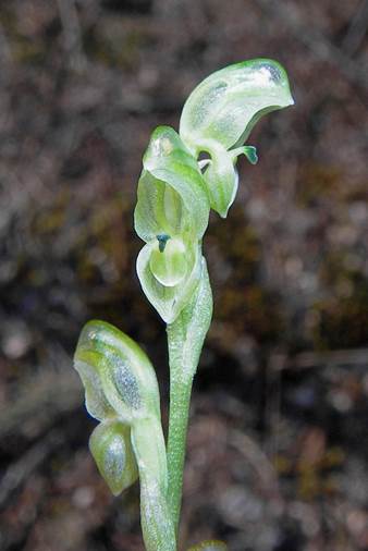 Leaves 5-8; lamina elliptical, 10-25 mm long, 5-12 mm wide, green, fleshy, margins entire, apex acute to apiculate. Scape 10-28 cm tall, 3-4 mm across, 5-12-flowered. Sterile bracts 4-6, closely sheathing, oblong to elliptic when flattened, 5-15 mm long, 4-6 mm wide, acuminate. Fertile bracts similar, closely sheathing. Pedicels ca. 4 mm long, straight, slender. Ovaries oblong to elliptic, 3-4 mm long, ca.1.5 mm wide. Flowers porrect, well-spaced, 8-9 mm long, 3-4 mm wide, translucent green with darker green veins. Dorsal sepal 7-9 mm long, 4-6 mm wide, slightly gibbous at the base, nearly straight or shallowly curved for most of its length, abruptly decurved near the apex. Lateral sepals deflexed, deeply saccate, dorsally gibbous, when flattened 4.0-5.5 mm long, 4.0-4.5 mm wide, points subacute, ca. 3 mm apart. Petals asymmetrical, more or less ovate-oblong, 6-7 mm long, 2.5-3.0 mm wide, translucent green with darker veins, dorsal margin strongly thickened, dark green, with a dorsal gibbosity just above the middle, ventral margin irregular. Labellum claw irritable, ligulate, ca. 1 mm long, c. 0.6 mm wide. Labellum lamina elliptic to obovate, 2.0-2.3 mm long, 1.8-2.0 mm wide, whitish green with a dark green appendage, membranous, apex emarginate. Basal appendage sharply recurved, narrowly oblong, 1.5-2.0 mm long, ca. 0.8 mm wide, margins dark green, thickened, central ridge narrow, raised above the margins, dark green, ending in a blunt beak 0.8-1.0 mm long. Callus a thickened, darker green, tapered medial ridge. Column obliquely erect, 6-8 mm long, shallowly curved, green with darker areas on the wings. Column wings more or less rectangular, ca. 2 mm long, ca.1 mm wide, basal lobe deltate, inner margins sparsely ciliate; barrier cilia ca. 0.2 mm long, clavate. Anther ca.1 mm long, obtuse. Pollinia clavate, ca.1 mm long, yellow, mealy. Stigma central, scutiform, ca. 2 mm long, ca.1.2 mm wide, raised. Capsules obovoid, 5-6 mm long, ca. 3 mm wide, green to brown, on pedicels to 5 mm long.