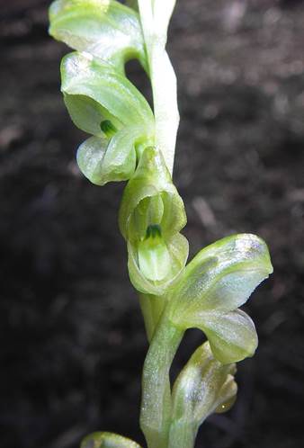 Leaves 5-9; lamina ovate to elliptical, 5-25 mm long, 3-15 mm wide, green, fleshy, dull; margins entire or slightly wavy; apex acute to apiculate. Scape 8-20 cm tall, 2-3 mm across, 3-12-flowered. Sterile bracts 2-4, closely sheathing, ovate to elliptic, 5-12 mm long, 3-5 mm wide, thin-textured, acuminate. Fertile bracts similar, closely sheathing the pedicel. Pedicels 3-5 mm long, straight, slender, mostly hidden within the bract. Ovaries oblong to elliptic, 3-5 mm long, ca. 1.5 mm wide. Flowers porrect, moderately crowded to separated, 8-10 mm long, ca. 3-4 mm wide, translucent green with faint darker green stripes.