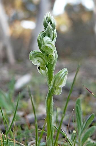 Leaves 5-11; lamina thickish, ovate to elliptical, 10-40 mm long, 5-15 mm wide, green to greyish-green, thin-textured, dull, margins entire, apex acute to acuminate. Scape 5-25 cm tall, 3-4 mm across, 5-18-flowered. Sterile bracts 3-6, closely sheathing to spreading, elliptic when flattened, 5-16 mm long, 4-8 mm wide, thin-textured, acuminate. Fertile bracts similar, closely sheathing. Pedicels 3-5 mm long, straight, slender. Ovaries oblong to elliptic, 3-5 mm long, ca. 1.5 mm wide. Flowers porrect, relatively crowded to well-spaced, 10-12 mm long, 3-4 mm wide, light green with narrow darker green stripes. Dorsal sepal 8-9.5 mm long, 4-5 mm wide, slightly gibbous at the base, shallowly curved for most of its length, abruptly decurved near the apex. Lateral sepals deflexed, deeply saccate, dorsally gibbous, when flattened 4-5 mm long, 4-5 mm wide, points subacute, 2-3 mm apart. Petals asymmetrical, more or less ovate, 6-7 mm long, 3-3.5 mm wide, translucent green with darker veins, dorsal margin strongly thickened, dark green, a dorsal gibbosity above the middle, ventral margin smooth or irregular. Labellum claw irritable, ligulate, ca. 1.6 mm long, ca.1.3 mm wide. Labellum lamina oblong, 2.2-2.5mm long, 1.8-2mm wide, whitish green with a dark green appendage, membranous, apex emarginate. Basal appendage recurved at right angles, oblong, ca.1.5 mm long, ca.1 mm wide, ca. 0.5 mm thick, margins dark green, thickened, central ridge narrow, raised above the margins, dark green, ending in a narrow, pointed beak 0.8-1 mm long. Callus a thickened tapered medial ridge. Column obliquely erect, 7-8 mm long, shallowly curved, green with darker areas on the wings. Column wings more or less rectangular, ca. 2.5 mm long, ca.1.5 mm wide, basal lobe deltate, inner margins strongly incurved, sparsely ciliate; barrier cilia ca. 0.4 mm long, clavate. Anther ca.1 mm long, obtuse. Pollinia clavate, ca. 0.8 mm long, yellow, mealy. Stigma central, elliptical, ca. 3 mm long, ca.1.3 mm wide, raised. Capsules 6-8 mm long, 3-4 mm wide, on pedicels to 9 mm long.