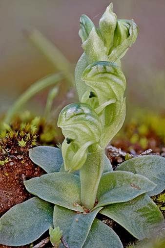 Recognition: Hymenochilus pagophilus is characterised by large rosette leaves (to 40 × 14 mm); short to tall, thick scape (to 35 × 0.4 cm); moderately crowded to crowded, shiny flowers to 12 × 6 mm; deeply saccate lateral sepals; ovate petals with beaded siliceous marginal cells; rectangular-obovate labellum to 3.0 × 2.8 mm; and, recurved oblong appendage with a narrow central ridge slightly raised above the margins.