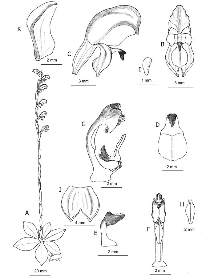 Leaves 3-7; lamina narrowly elliptical to narrowly ovate, 10-35 mm long, 3-12 mm wide, green, dull, margins entire, apex acute, acuminate or apiculate. Scape 5-18 cm tall, 0.5-1.5 mm wide, 1-16-flowered. Sterile bracts 3-5, closely sheathing, ovate to elliptic when flattened, 5-10 mm long, 2-4 mm wide, thin-textured, acuminate. Fertile bracts similar, closely sheathing. Pedicels 3-20 mm long (longest on lower flowers), straight, very slender. Ovaries oblong to elliptic, 3-5 mm long, 1.0-1.5 mm wide. Flowers porrect, widely spaced, 7.5-9 mm long, 3-4 mm wide, translucent green with faint darker green stripes. Dorsal sepal 7-9 mm long, 4-5 mm wide, porrect from the ovary at the base, shallowly curved for most of its length, abruptly decurved near the apex. Lateral sepals obliquely deflexed to deflexed, shallowly saccate, dorsally curved, when flattened 4.5-6.0 mm long, 6-7 mm wide, points subacute, 3-4 mm apart. Petals asymmetrical, rhomboid, 4.5-6.5 mm long, 3-4 mm wide, translucent green with darker veins, dorsal margin strongly thickened, dark green, a dorsal gibbosity above the middle, ventral margin with beaded siliceous cells. Labellum claw irritable, ligulate, ca.1.4 mm long, ca.1 mm wide. Labellum lamina obovate, often widening evenly from the base, 2.0-2.5 mm long, 1.5-2.0 mm wide, whitish green with a light green to dark green basal appendage, membranous, apex emarginate. Basal appendage recurved at right angles or more, oblong, ca.1.6 mm long, ca.1 mm wide, margins light green to dark green, thickened, central ridge narrow, hardly raised above the margins, dark green, ending below the apex of the appendage in a very short blunt beak. Callus a thickened, tapered, channelled medial ridge. Column obliquely erect, 6-7 mm long, shallowly curved, green with darker areas on the wings. Column wings more or less rectangular, ca. 2.3 mm long, ca.1 mm wide; basal lobe ovate to deltate, inner margins incurved, sparsely ciliate; barrier cilia ca. 0.3 mm long, linear to clavate. Anther ca. 0.8 mm long, obtuse. Pollinia oblong-clavate, ca.1 mm long, yellow, mealy. Stigma central, elliptical, ca. 2.5 mm long, ca.1 mm wide, raised. Capsules 5-8 mm long, 3-4 mm wide, on pedicels to 10 mm long. (Fig. 8).
