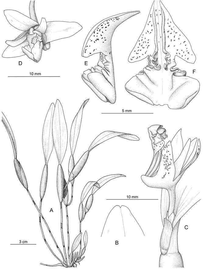 Plant lithophytic or epiphytic; rhizome creeping, 1.5-3.2 mm in diameter, with 1-2 internodes, each 3-4 mm long; stems branched, glabrous. Pseudobulbs oblong to fusiform, slightly compressed, 2.5-5.5 cm long, 0.5-1.2 cm in maximum diameter, sometimes longitudinally furrowed. Foliage leaves subsessile, oblong-lanceolate to lanceolate, 6.5-9.0 × 1.5-2.5 cm, coriaceous, glabrous, apex obtuse and minutely retuse. Inflorescence arising adaxially, 1-flowered; peduncle 4-6 mm long, glabrous, enveloped by several scale-like sheaths. Flower lasting less than a day; sepals, petals and mentum pale greenish yellow, with purplish markings near base on the dorsal surface, lip white with small purple markings scattered on disk and side lobes, column pale yellow with red dots around the stigmatic cavity, ovary and pedicel yellow. Sepals spreading, recurved; dorsal sepal oblong, subacute to obtuse, 10.0-12.5 × 2.5-3.0 mm, glabrous; lateral sepals ovate-lanceolate, subacute to obtuse, 11-13 × 3-4 mm, glabrous, base oblique and broad; mentum at a right angle to ovary, 5-6 mm long, ca. 0.5 times as long as dorsal sepal, obtuse. Petals spreading, recurved, linear-lanceolate, (sub)acute, 8-10 × 1.5-2.0 mm, entire, glabrous. Lip porrect, trilobed, 10-12 mm long, glabrous; disk ornamented with a pair of lateral keels extending from near lip base to claw of mid-lobe where they become undulate lamellae; side lobes erect, incurved, obliquely triangular-ovate, obtuse, entire, apices 6.0-6.5 mm apart when folded down; mid-lobe distinctly clawed (claw broader than long), 7.5-8.0 mm in maximum width, bilobulate with obliquely obovate-oblong lobules measuring 2.9-3.2 × 2.6-3.0 mm, entire, basal margins strongly undulate. Column subterete, slightly incurved, ca. 3.0 mm long; column foot ca. 5.0 mm long. Ovary with pedicel semifusiform-terete, 3-5 mm long, glabrous.