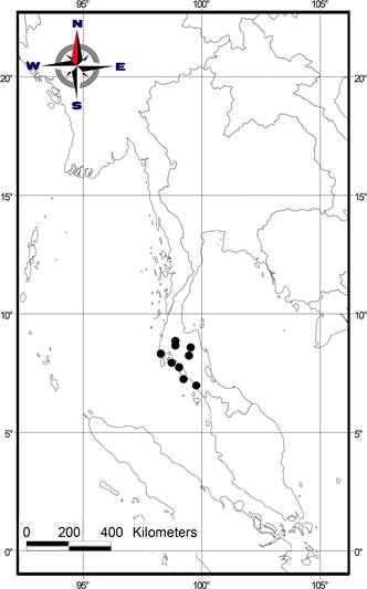 Distribution: Apparently endemic to peninsular Thailand and small nearby islands (Fig. 3). However, as D. krabiense occurs close to Thailand’s southern border in Satun province, it should also be searched for in the northern part of Peninsular Malaysia.