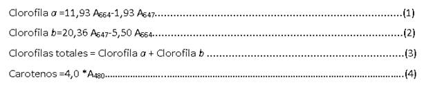 Posteriormente se realizan las determinaciones espectrofotométricas de clorofilas a, b y carotenos, determinando la absorbancia a 480, 630, 647 y 664 nm contra un blanco de acetona al 90 %. La concentración de cada uno de los pigmentos (µg mL-1) se determinó mediante las ecuaciones (1 -3) y por sumatoria la concentración de clorofilas totales: