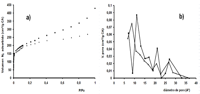 Las isotermas de adsorción de N2 a 77 K fueron realizadas en un equipo Quantachrome Autosorb (sistema analizador de superficies). Para el análisis de los datos se empleó la ecuación BET para la determinación del área superficial (ASN2) utilizando el software del equipo y el Método de microporo (MP) para el cálculo de la distribución de poros y tamaño medio de poro.