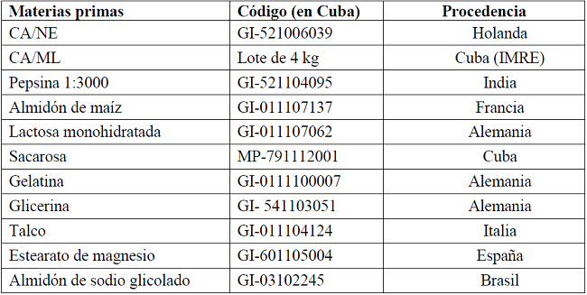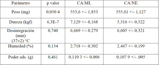 Los polvos de CA cumplieron con los requisitos establecidos por la USP como materia prima. Los comprimidos de CA/ML obtenidos con formulación cubana a escala de banco, mantuvieron sus parámetros estables durante el estudio acelerado y vida de estante. No se observaron diferencias significativas entre los comprimidos obtenidos con CA/NE y CA/ML. Por los resultados alcanzados con el CA cubano este pudiera ser considerado candidato para la industria médico farmacéutica, tanto como materia prima como forma terminada.