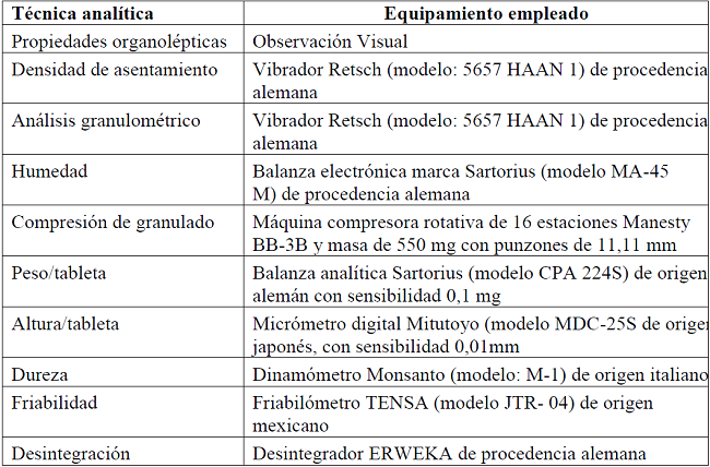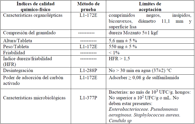 En la elaboración de las formulaciones ensayadas se empleó el método de vía húmeda y se procedió, según los pasos que se describen en el Expediente Maestro del producto: Especificaciones de calidad de producto terminado de carbón y pepsina, tabletas.9 En la formulación de los comprimidos se emplearon los ingredientes presentados en la tabla 1 y las técnicas analíticas y el equipamiento enumerado en la tabla 2.