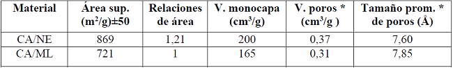 Las isotermas de adsorción de N2 a 77 K obtenidas por la ecuación BET, son mostradas en la figura 1a. Ambas ASN2 720 m2/g (CA/ML) y 869 m2/g (CA/NE) pueden ser consideradas del mismo orden. Se puede observar que los dos materiales muestran una distribución polimodal de poros, figura 1b. Este aspecto es relevante para materiales de este tipo, porque permite la adsorción de moléculas de diferentes tamaños y estructuras. La distribución de poros y tamaño medio de poros fueron calculados por el método MP (tabla 4). Las diferencias que puedan observarse en el área superficial y distribución de poros responden principalmente a la materia prima empleada y a la historia tecnológica durante la producción de ambos CA. Por ejemplo, CA/ML fue obtenido a partir de madera y CA/NE a partir de turba.