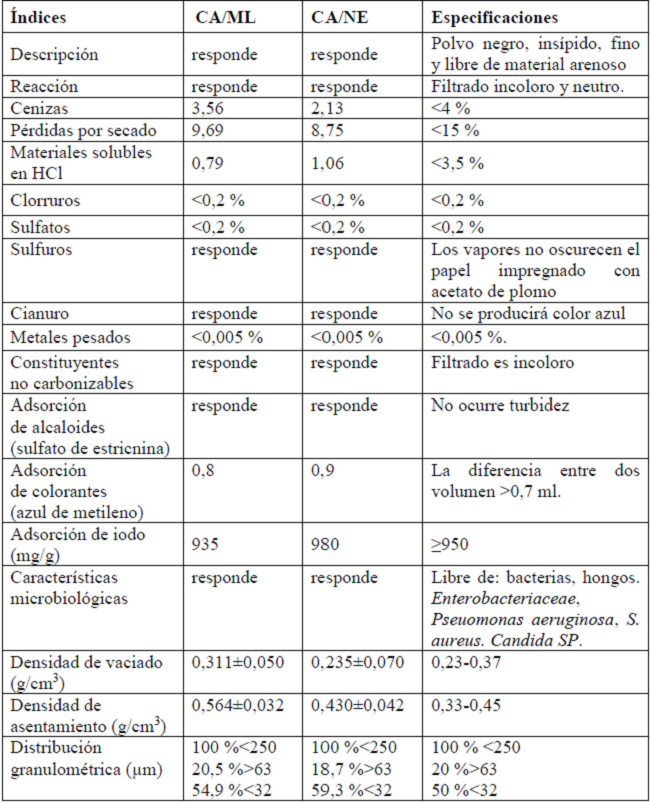 Los CA empleados fueron obtenidos a escala industrial. El CA/NE es un material que la industria farmacéutica cubana viene utilizando hace más de diez años en hospitales y centros farmacéuticos en Cuba. Es un material que ya ha sido probado industrialmente como materia prima y producto terminado, así como su calidad terapéutica como comprimido de carbón y pepsina y antídoto.4 El CA/ML es un material obtenido en la Planta Industrial de Carbón Activado, ubicada en el municipio de Baracoa, Provincia de Guantánamo y purificado por lixiviación ácido/base.5-7