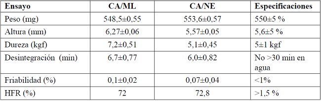 Los comprimidos obtenidos inicialmente con CA/ML cumplen con la mayoría de las especificaciones establecidas, excepto para el parámetro altura de comprimido, lo que no es un problema crítico, desde el punto de vista del envasado de las tabletas (ver tabla 6), ya que las mismas serán envasadas en frascos plásticos, lo cual permite una mayor flexibilidad durante esta operación. La resistencia a la dureza también fue superior al valor de la norma y a la del patrón de referencia (CA/NE). Sin embargo, no se observan efectos negativos en la desintegración de la tableta que es el parámetro que más se afectaría en este caso, y que se mantiene dentro de la especificación establecida, lo que permitió pasar al de estabilidad acelerada.