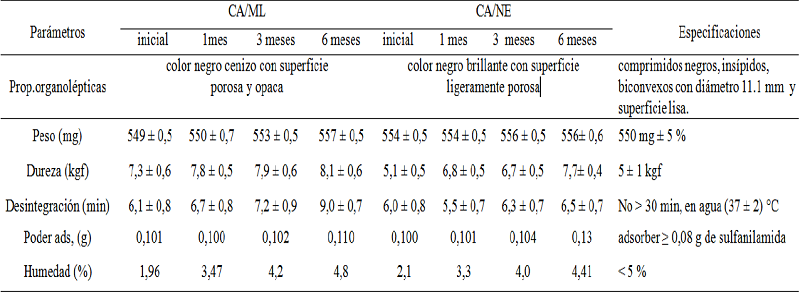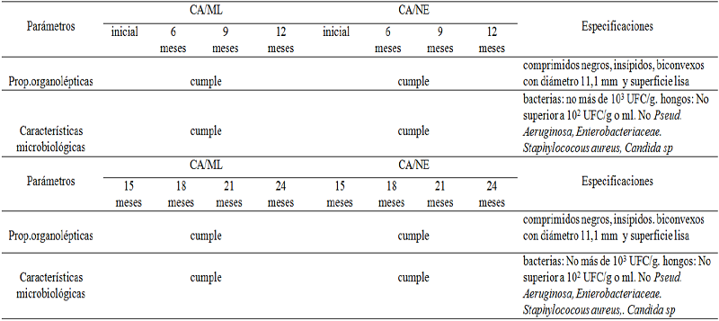 Estudio comparativo de estabilidad de los lotes de comprimidos de carbón-pepsina producidos con CA/ML y CA/NE con formulación cubana
