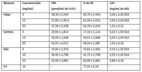 Los resultados de la actividad antioxidante señalan que todos los extractos evaluados mostraron actividad antioxidante (tabla 1). Con respecto a la actividad determinada por el método FRP, esta se incrementa con el aumento de la concentración para los tres órganos explorados. Los mejores valores del poder reductor se encontraron para los extractos de raíz y de hojas a una concentración de 50 mg/mL (55,58 ± 3,89 y 47,38 ± 3,32 equivalentes de Fe (II), respectivamente). Los extractos de la corteza fueron los de menor actividad para las tres concentraciones ensayadas.