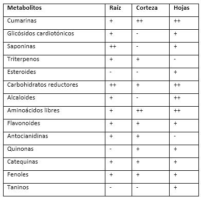 La actividad antioxidante de los distintos órganos de la planta podría deberse a la presencia en las hojas de flavonoides, quinonas, taninos y cumarinas; en la corteza a las cumarinas, los flavonoides y las antocianidinas; y en la raíz a los flavonoides, las antocianidinas, los terpenos y las cumarinas. La alta actividad antinflamatoria encontrada en los extractos de hojas y raíces pudiera relacionarse con su contenido de saponinas, terpenos o esteroides y glucósidos cardiotónicos.