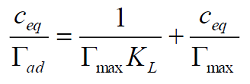 (1)where: Γ is the amount adsorbed Γ is the maximum sorption capacity C is the equilibrium concentration K is the Langmuir constant related to the adsorption energy. Plot of c/Γ c gives a straight line of slope 1/ Γ and intercept 1/ ΓK. The empirical Freundlich model, which is employed to describe heterogeneous systems, is expressed in its logarithmic form by the :