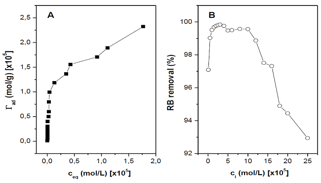 The adsorption isotherm of RB onto NZ and the percent of the dye uptake by the zeolite are shown in figure 2. The shape of the isotherm, in particular its high initial slope in the region of low concentrations, denotes the great affinity of the dye by the zeolite. It can be noted from figure 2B that the percent of RB removed by NZ is greater than 92 % in a wide range of concentrations. In the range between 0.5 - 10 x 10-5 mol/L it is even bigger than 99 %, which constitutes an excellent result from the point of view of environmental applications.