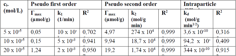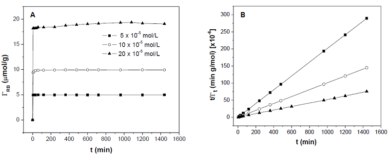 Kinetics experiments were performed under the same conditions at constants initial RB concentrations of 5, 10 and 20 x 10-5 mol/L. The RB concentration before and after the interaction was determined by UV spectroscopy by measuring absorbance at λ = 552 nm and the amount adsorbed was calculated by the depletion method.