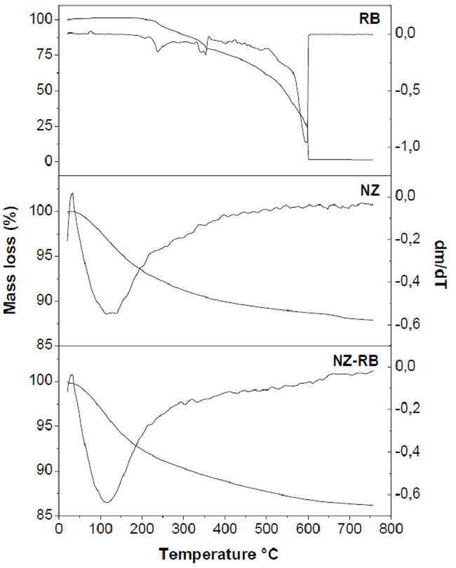 Figure 4 shows the TG - DTG curves for RB, NZ, and NZ-RB sample with a loading of about 20 µmol/g. The thermogram of RB exhibits several stages of mass loss between 210 - 605 °C, which are related to different step of compound decomposition. The total mass loss in NZ, of about 12 %, occurs in two stages. The first loss of mass, at a minimum of 125 °C, is associated with desorption of physically adsorbed water. The second stage between about 300 - 750 °C is due to the release of the water molecules coordinated to the cations (that are progressively removed) and to dehydroxylation. The dye adsorption doesn’t significantly influence the thermal stability of the zeolite, as can be observed in the thermogram of the NZ-RB sample. Moreover, the dye decomposition peaks are not observed because the amount adsorbed on NZ is almost in the detection limit of the used equipment (about 1 % in weight).