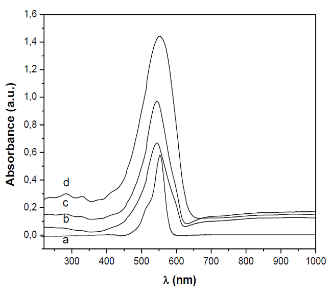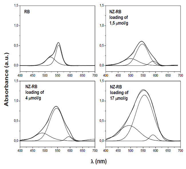 The UV-VIS spectrum of rhodamine B and the UV-VIS-DRS spectra of NZ-RB samples are shown in figure 5. The spectrum of RB in aqueous solution presents two peaks at 522 and 554 nm, corresponding to H-dimers and monomeric species, respectively.30 In the spectra of NZ-RB samples both bands can be observed, indicating that the dye is absorbed in its monomeric form and as aggregates. An increase in the absorbance of both peaks is observed as a function of the amount of dye adsorbed, although there is not a linear relationship. The deconvolution of the UV-VIS spectra (fig. 6) shows that in NZ-RB samples a new band with small intensity appears at around 590 nm, which could be assigned to J-dimers. The presence of J-dimers has been previously reported for RB and R3B adsorbed on different clays.(29, 30) In addition, a blue shift of the band at 554 nm in the spectra of NZ-RB samples of about 7 nm is observed, which could be due to the change in the local environment of the molecules.