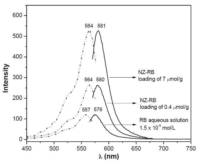 It is interesting to note that the dye exhibits an increase in the fluorescence intensity when it is absorbed onto NZ. Such increase depends of the amount of dye adsorbed. This result is expected when no aggregates are formed in the zeolitic surface, because it is known that the presence of aggregates leads to fluorescence quenching. Thus, in our case, where monomers, and H- and J- dimers are present in the material, the increase in the fluorescence intensity could suggest the existence of host-guest interactions between NZ and the RB chromophore. Taking into account these facts NZ-RB samples could be good candidates for further applications such as optic and laser systems.
