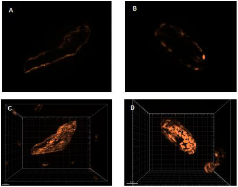 The epifluorescence images were acquired employing a Zeiss fluorescence microscope with ApoTome attachment (Axio Imager 2.1) with 40x/1,3 oil immersion objective. A coolsnap HQ2 camera was employed. The excitation was performed between 532 - 558 nm and the emission was recorded between 570 - 640 nm. The ApoTome structured-illumination attachment allowed optical sectioning using the camera and the AxioVision software allowed automatic collection of multi-channel Z-stack images.