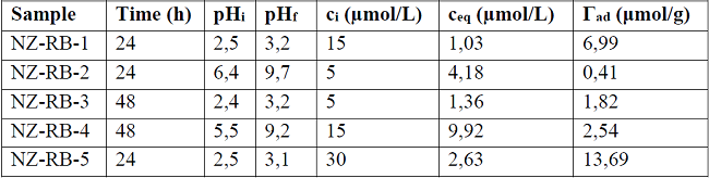 To perform an initial screening, adsorption experiments were carried out shaking 0,25 g of NZ with 25 mL of RB aqueous solutions at room temperature, varying the initial pH, the adsorbate concentrations and the contact time. The adsorption isotherm at 30 oC was obtained by shaking 0,25 g of NZ with 25 mL of RB solutions at different concentrations (0,1 x 10-5 - 25 x 10-5 mol/L) at pH = 2 for 24 h. The adsorption data were analyzed employing the commonly used Freundlich and Langmuir isotherms. The Langmuir isotherm, based on the assumption of the adsorption at specific homogeneous sites within the adsorbent, is expressed in its linear form by the following equation: