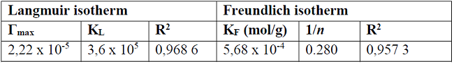 The parameters obtained by the fit of the experimental data according to Freundlich and Langmuir isotherms are presented in table 2. As can be see the fits for the two isotherms are quite similar, although the correlation coefficient obtained from the Langmuir isotherm is slightly higher than that from the Freundlich isotherm. Based on the Langmuir adsorption constant, KL, the standard free energy (ΔGo) of the RB adsorption process was calculated (