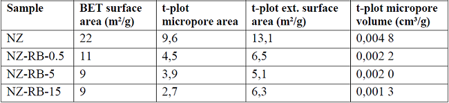 Nitrogen adsorption measurements were conducted using TriStar II 3020 equipment. Before measurements NZ was degassed at 300 oC under vacuum over the night employing a micromeritics VacPre 061 sample degas system. The NZ-RB samples were degassed at 110 oC to avoid dye decomposition. The measurement for NZ degassed at this temperature was also performed to compare.