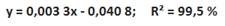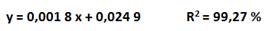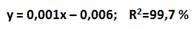 The quantification of total proteins was performed following the Lowry methodology.22 One milliliter of the samples (1 mg/mL solution based on total solids) were added to 5 mL of the Lowry reagent, which is composed of three solutions mixed at the time of use: 2 % sodium carbonate in 0,1 M NaOH (50 mL), 1 % cupric sulfate (0,5 mL) and 2 % sodium potassium tartrate (0.5 mL). After 15 min, 0,5 mL of Folin-Ciocalteu reagent was added, allowing the mixture to stand for another 30 min. At the end, absorbance was measured at 595 nm. A standard curve was prepared using Bovine Serum Albumin (BSA) in a concentration range between 5 - 200 μg/mL. The mathematical equation that describes it behavior is reflected in equation 3. The results were expressed as g BSA equivalent /100 g extract.