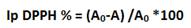 It was followed the standard methods described in the literature.26 In brief: A solution of 0.1 mM of DPPH (MERCK, pure for analysis, USA) was prepared using 0,003 94 g dissolved in 100 mL of ethanol. A total of 0,25 mL of the extracts (solutions of 62,5, 125, 250, 500 and 1 000 μg/mL based on total solids) were placed in test tubes, where were added 1,5 mL of the DPPH solution. The mix was shaken in a vortex (Heidolph REAX 2000, Germany) and kept in the dark for 20 min. The absorbance was measured in spectrophotometer (T60 UV-Visible Spectrophotometer) at 517 nm.The absorbance blank was prepared with 0,25 mL of ethanol and 1,5 mL DPPH solution.The positive control was an ascorbic acid solution a concentration of 1 mg/mL. The radical sequestration ability was determined by calculating the percent inhibition of the radical (Ip DPPH) by the equation: