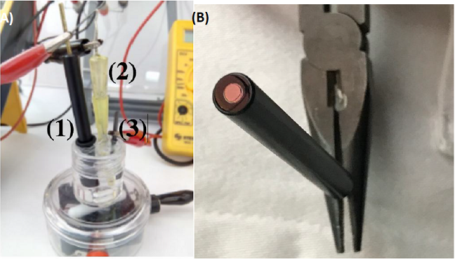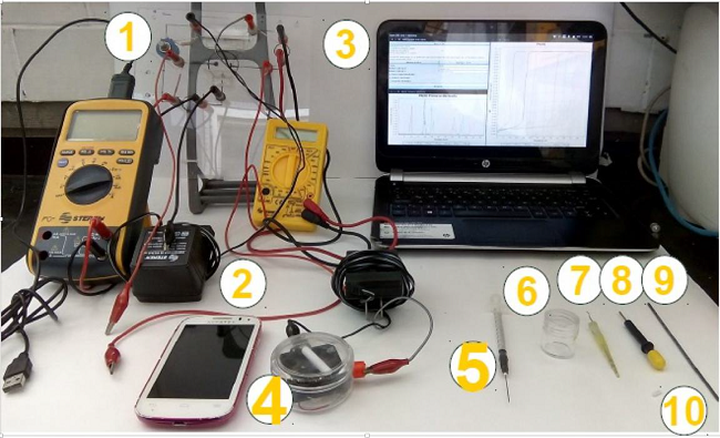 La figura 1 muestra el equipo empleado para el electrodepósito y la detección potenciométrica del PCA durante el paso de la redisolución, donde (1) corresponde al micro polarógrafo de mínima instrumentación diseñado para la imposición de la perturbación eléctrica;2 es el teléfono móvil con equipado con cronometro y con un programa de procesamiento de datos, aunque su empleo es opcional y puede ser remplazado por una computadora.3 En4 se aprecia una agitador magnético construido también con materiales de bajo costo; en5 se muestra la jeringa de insulina desechable utilizada para la dosificación de los volúmenes que fueron colocados en 6 el frasco de plástico trihoradado (con capacidad máxima de 5 mL) para celda de análisis. Los electrodos utilizados fueron7 ER: de Ag0|AgCl,KCl sat.||;8 ET, disco de carbón vítreo, d = 0,3 mm y (9) EA construido con una barra de grafito número 2, HB. Finalmente, todas las disoluciones fueron homogenizada con ayuda de una barra de agitación de teflón.