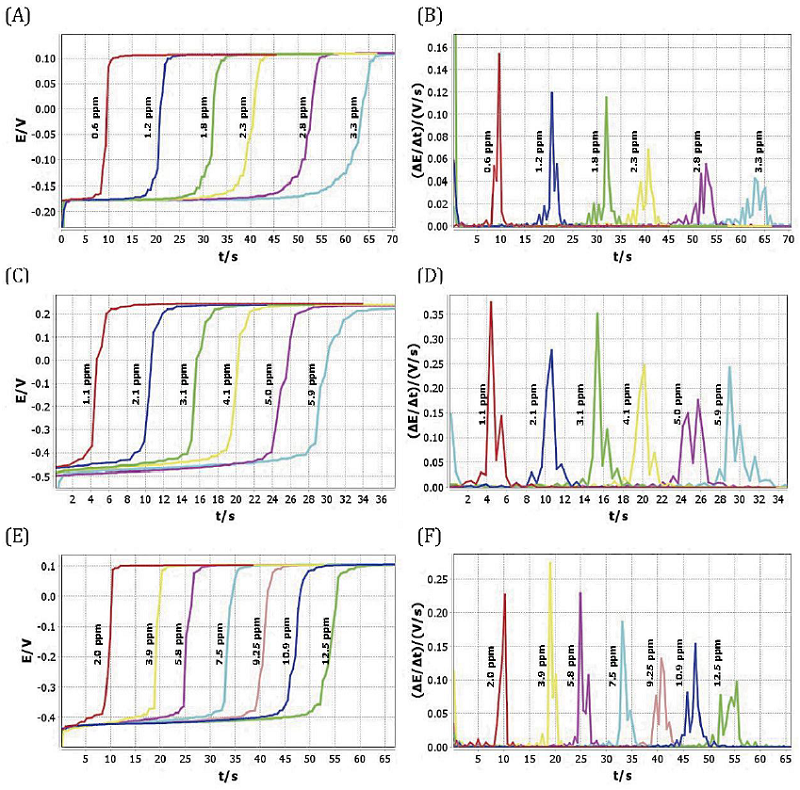 En la figura 3 se muestran los registros típicos de cronopotenciogramas del PCA para (A) Cu(II), (C) Cd(II) y (E) Pb(II), así como sus respectivos cocientes del valor del PCA con respecto al tiempo, utilizado para determinar el tiempo de transición, τ, en intervalos de 2 a 9 ppm para (B) Cu(II), (D) Cd(II) y (F) Pb(II). Se ha informado que τ es directamente proporcional a la concentración en disolución, de acuerdo a los trabajos de Aoki y Osteryoung.18 Los valores de las concentraciones analizadas en cada caso se anexan al lado de los registros.