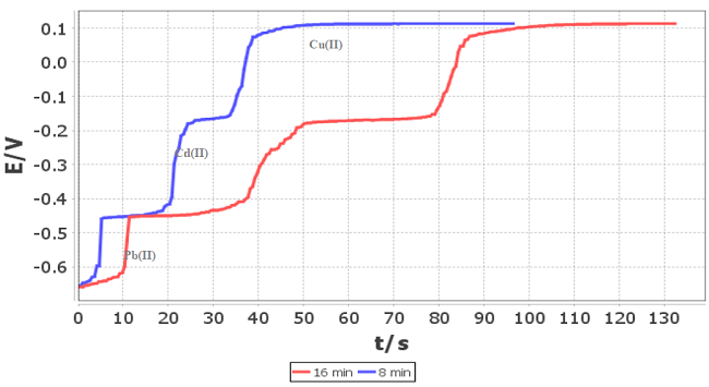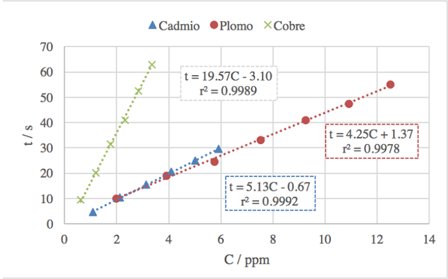 Para la determinación de las curvas de calibración se utilizaron 5,0 mL del medio de reacción en la celda, 0,1 mL de Hg(II) 2,5 mmol/L y alícuotas de 0,1 mL de disolución estándar 0,5 mmol/L del catión a analizar en cuestión. Se impuso un Epol = -1,15V vs. ER durante cuatro minutos con agitación constante. Posteriormente se registró el cronopotenciograma a corriente nula, EPCA = f(t). Se ensayaron tiempos de electrodepósito de 8 y 16 min.