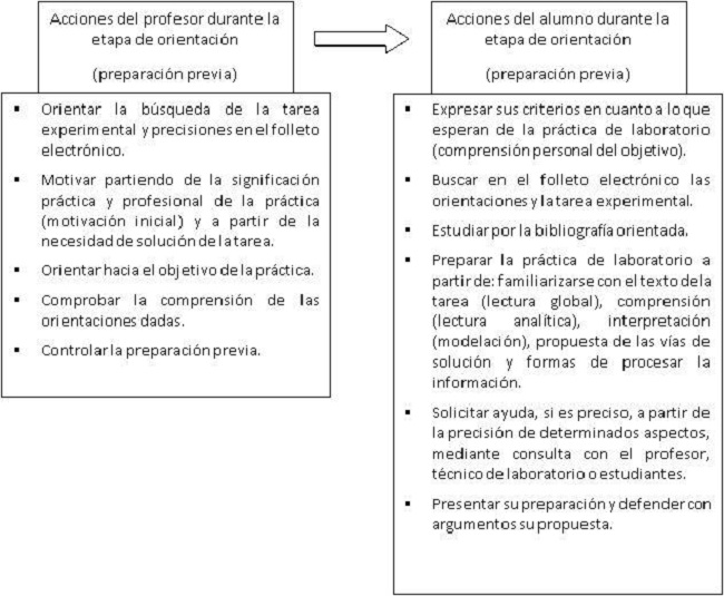 En la figura 1 se detallan acciones a realizar por el profesor y los estudiantes durante la etapa de orientación previa de la práctica de laboratorio.