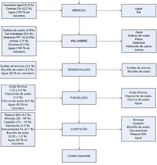 La producción de la culata piquelada se realiza mediante un proceso productivo, cuyas etapas fundamentales son: remojo, pelambre, desencalado, piquelado y curtición (figura 1).