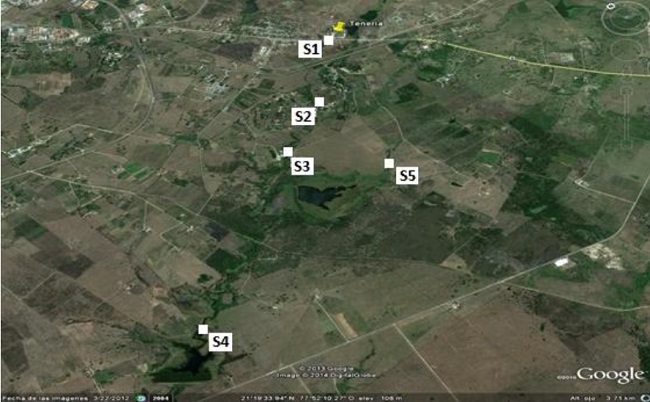 Las estaciones de monitoreo fueron las siguientes: S1 - Puente de Santayana; S2 - San Blas; S3 - Cochiquera; S4 - Entrada a la presa “La Peste”. Adicionalmente se estableció otra estación de monitoreo (S5) en un cuerpo de agua superficial no contaminado por los vertimientos de la tenería, con el objetivo de obtener valores de referencia de diferentes parámetros físico-químicos para las aguas superficiales en el área de estudio.
