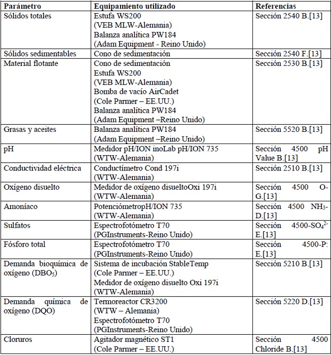 Se realizaron mediciones in situ y en el laboratorio, tomando como referencia fundamental el Standard Methods.13 Las mediciones in situ se realizaron con ayuda de los siguientes equipos de la firma alemana WTW: el potenciómetro pH/ION inoLab 735, el conductímetro Cond 197i y el oxímetro Oxi 197i. La tabla 2 brinda una información resumida sobre los procedimientos analíticos empleados.