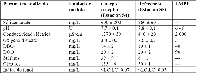 El impacto de la contaminación en la calidad del agua del cuerpo receptor se observa en la elevación de la conductividad eléctrica en cerca de tres veces, como resultado del incremento de los sólidos totales. La contaminación orgánica se logra reducir hasta casi los valores de referencia, pero el oxígeno disuelto no alcanza la mitad del valor de saturación.