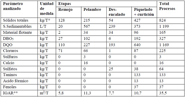 Los indicadores de contaminación, empleados en esta tenería como valores de referencia, muestran que las mayores cargas contaminantes se generan en las etapas de piquelado-curtición y pelambre (tabla 1).