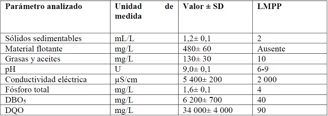 Una vez analizados los resultados obtenidos, se observa que para los sólidos sedimentables, el fósforo total y el pH, los valores se encuentran dentro de los límites establecidos por la norma cubana. Por otro lado, vale resaltar que en el caso de las grasas y aceites las concentraciones obtenidas superan 13 veces el límite máximo permisible y la DBO5 y la DQO los superan en 155 y 380 veces, respectivamente.