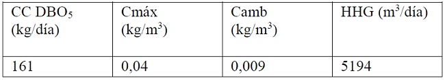 La evaluación de la carga contaminante (expresada para la DBO5) se realiza a partir de los resultados de la caracterización de aguas residuales en el colector general de la tenería. El caudal de aguas residuales se tomó de las mediciones periódicas que se realizan en la industria y que brindan una media de 26 m3/d. La tabla 4 muestra los resultados de la evaluación.