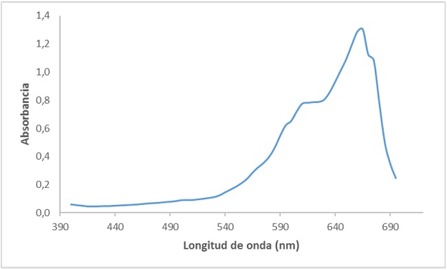 Las lecturas de absorbancia se hicieron en un espectrofotómetro UV-Visible, GENESYS 10, Estados Unidos, con longitud variable de 100 a 800 nm. Se realiza un barrido de exploración de 400 a 700 nm para escoger la longitud de onda de máxima de absorción, la seleccionada fue de 665 nm correspondiente al máximo de absorbancia (figura 2). Posteriormente, se realiza la lectura de cada patrón a la longitud de onda de máxima absorción (665 nm) y se obtiene la curva de calibración.