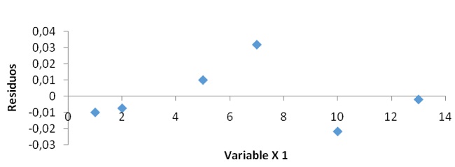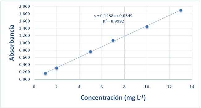 En la figura 3 se presenta la curva de calibración obtenida, en el rango de concentraciones de 1 a 13 mg L-1. El coeficiente de correlación lineal (R2) obtenido para esta curva es de 0,999 2, lo que demuestra que el modelo lineal se ajusta perfectamente a los datos experimentales y que la curva de calibración cumple con la ley de Lambert-Beer, en el intervalo de concentraciones analizado. La evaluación de la condición de homocedasticidad se realizó mediante el análisis de los residuos (figura 4), observándose la distribución homogénea de los mismos, por lo que se considera que el modelo presenta un buen ajuste a los datos, corroborando lo planteado anteriormente.