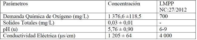 El agua residual efluente de la entidad presenta valores de DQO muy por encima del Límite Máximo Permisible Promedio (LMPP) para alcantarillado (700 mg L-1) según NC 27/2012 5 (tabla 1). Dicho resultado es esperado por la cantidad de productos orgánicos que se usan en el proceso de producción y por solo contar la fábrica con un tratamiento primario consistente en una fosa séptica. Este parámetro es fundamental en la caracterización de las aguas residuales de industrias textiles ya que la característica fundamental de dichas aguas residuales es la elevada carga orgánica que presentan, así como su elevada coloración.
