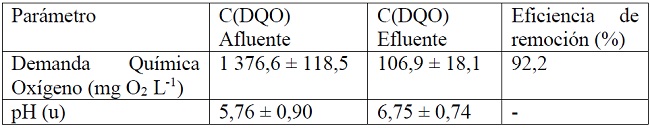 Como se muestra en la tabla 2, la eficiencia de remoción de materia orgánica en el agua residual efluente de la Fábrica “Juan Pedro Carbó Serviá” después de ser tratada en el humedal experimental fue elevada (92,2 %), demostrando la efectividad de estos sistemas de tratamiento para la remoción de compuestos orgánicos, como se explicó anteriormente.18-21 Se obtiene un valor de DQO y pH que cumple con el LMPP para el vertimiento al alcantarillado, parámetros que con el sistema de tratamiento instalado actualmente en la entidad no cumplen con la legislación vigente, pudiéndose implementar un humedal subsuperficial como tratamiento secundario en la entidad antes de ser vertidas sus aguas residuales al alcantarillado.