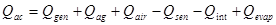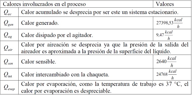 Donde: Q= Velocidad de acumulación de calor. (kcal/h) Q= Velocidad de generación de calor debido agitación. (kcal/h) Q= Velocidad de generación por aireación. (kcal/h) Q = Velocidad de pérdida de calor por evaporación. (kcal/h) Q = Velocidad de generación de calor metabólico. (kcal/h) Q= Velocidad de intercambio de calor en el biorreactor. ( kcal/h) Q = Velocidad de generación de calor sensible. (kcal/h) U = Coeficiente global de transferencia de calor. (kW/mºC) ΔT = Diferencia media de temperatura entre el medio de cultivo y el medio de enfriamiento. (°C) A = Área de transferencia de calor. (m) C = Capacidad calórica (kcal/kg ºC) m = Masa