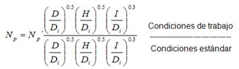 El número de potencia es de 1,8 según fig. 2, pero como el biorreactor modelo no cumple con las relaciones de magnitudes estándares para agitadores de turbina de hojas planas, por lo que el Np de trabajo se obtiene mediante la ecuación siguiente: