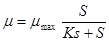El crecimiento microbiano fue estudiado y modelado según la ecuación de Monod para un sistema discontinuo.8 La ecuación de Monod, relaciona la velocidad máxima de crecimiento con la concentración del sustrato limitante, la que se expresa como: 9-12