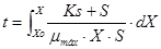 Donde: X = Concentración final de biomasa. (g/L) X = Concentración inicial de biomasa. (g/L) S = Concentración final de proteínas totales. (g/L) S= Concentración inicial de proteínas totales. (g/L) = Velocidad específica de crecimiento. (h) = Velocidad específica máxima de crecimiento. (h) Ks = Constante de saturación. (g/L)