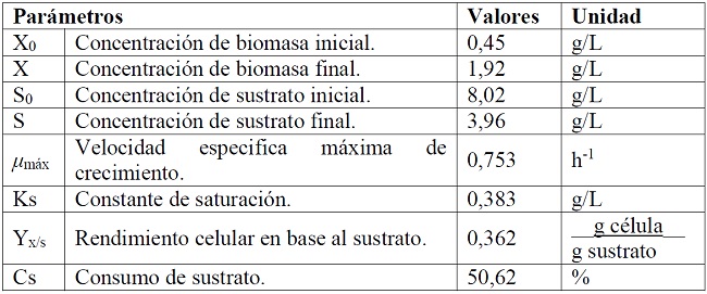 Durante el tiempo de operación de la fermentación fue monitoreado la concentración de biomasa y el consumo de sustrato contra el tiempo. Después de 4 h de fermentación, la densidad óptica se mantuvo constante y el pH alcanzó el valor de 7,2. Se evaluó el rendimiento de biomasa y el consumo de sustrato. En la tabla 1 se observa los parámetros estudiados.